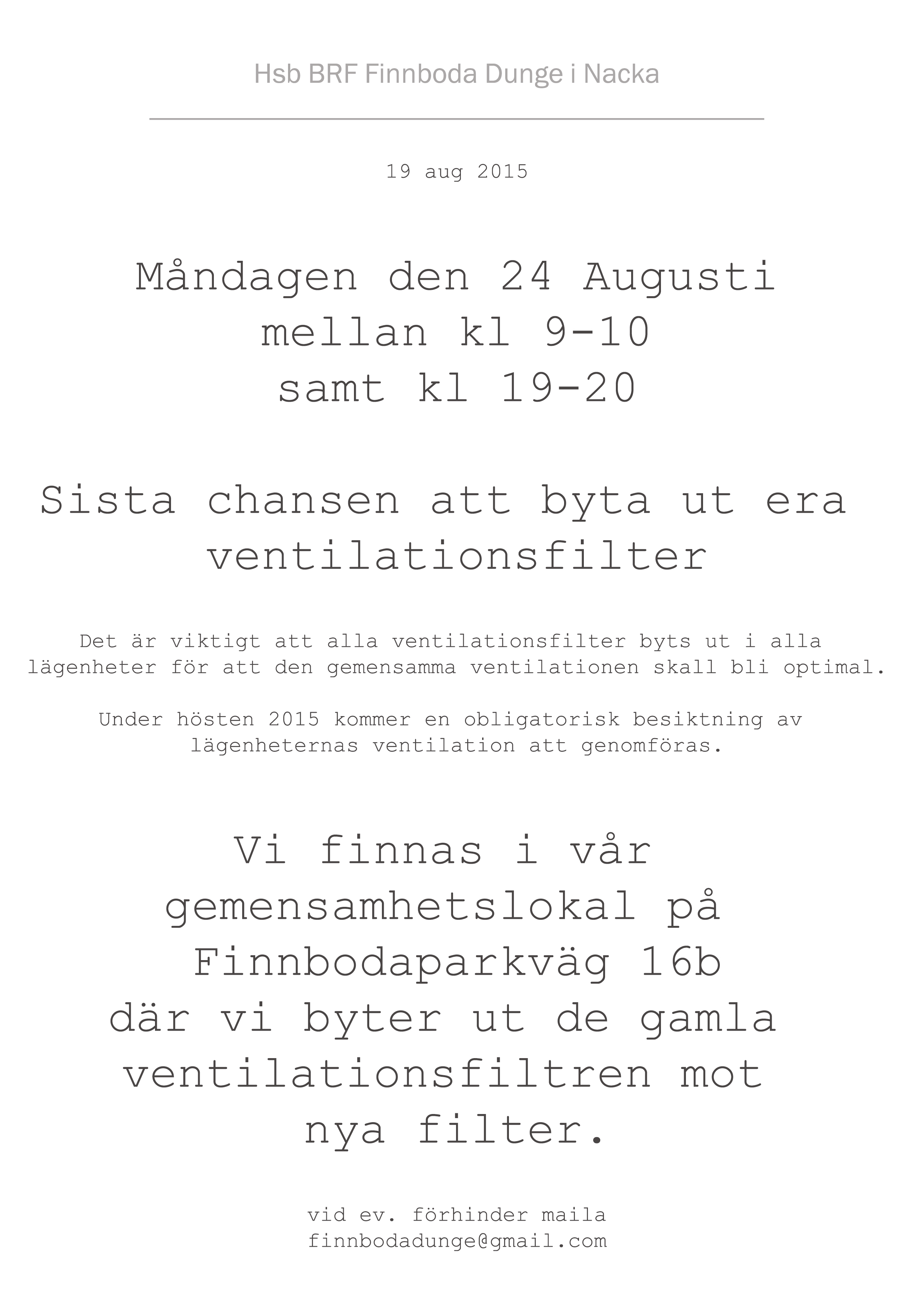 Sista chansen för byte av ventilationsfilter Den 18 augusti, 2015 Av finnbodadungei Uncategorized Dela detta: Dela på X (Öppnas i ett nytt fönster) X Dela på Facebook (Öppnas i ett nytt fönster) Facebook Gilla Laddar in …
